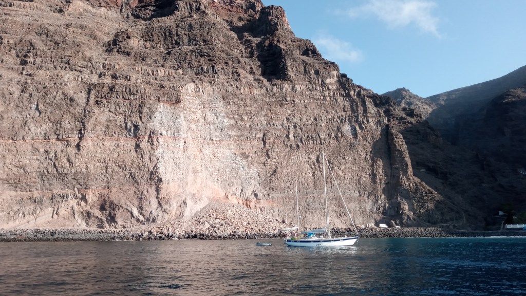 The day has arrived to start making my way back East. I will leave Sea Orchid in Las Palmas until I return in the new year. However getting back there is not as easy as coming from there, given the prevailing north easterlies, and in fact from tomorrow the winds are going east to south east which makes it even more difficult. Delaying a week is no better though as then very strong north westerlies arrive for another week. So I have multiple passage plans with options, and will have to be flexible and play it by ear. The most ambitious idea is to do it in one long hop, 190 nm going north of Gomera, south of Tenerife and north of Gran Canaria. I slip out of Tazacorte in virtually no wind and head toward the southern tip of La Palma. The coastline along this stretch is one of banana plantation terraces on impossibly steep mountain slopes. The ridge which I walked the other day in clear skies, today is shrouded in cloud. Crossing to La Gomera the wind is due east and it is soon apparent that I can’t hold a course high enough to pass north, so plan A.1 kicks in and I go to the south. Late afternoon and the wind veers south east so bang on the nose. There seems little point in motoring into a headwind for half the night so I decide to put into Puerto de Vueltas at the mouth of Valle de Gran Rey. I am surprised to find 10 boats already at anchor but there is plenty of room and the holding is said to be very good, just off the stony beach and a short distance from the harbour.