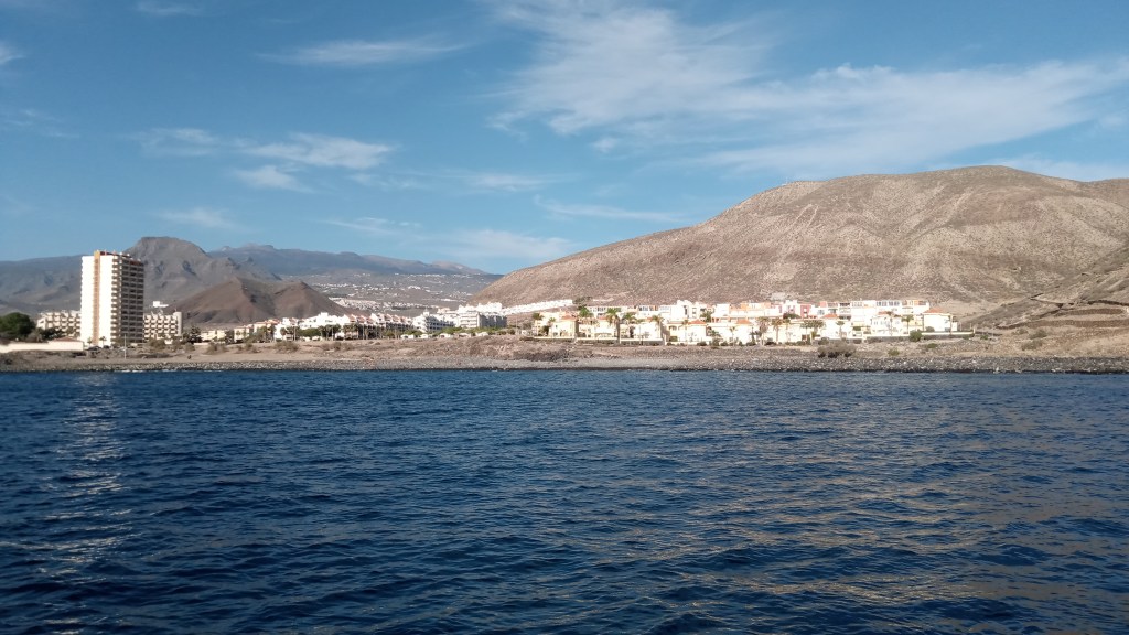 The forecast is similar to yesterday so I am definitely leaving ! I make my escape at first light and enjoy a very pleasant beat around the south west coast of Gomera. Then I try to head for the southern tip of Tenerife, however it is initially directly into the wind, so first I decide to head south east, to be clear of the effects of the island land masses which have a very dominant influence. But I am steadily headed so tack and head north east, directly toward the towering landmass of Mount Teide. I need a change in wind direction to make any decent progress so hope that Teide might provide just such a disruptive effect. And indeed so it did, as I got closer to Tenerife, the wind veered more and more to the south so that I was lifted and almost able to lay a course for the southern tip. In the end, with leeway, I came to the town of Los Cristianos, just a few miles from Punta Salema. I tacked and sailed along close offshore and then noticed some boats anchored in a small bay, which I had previously discounted as normally exposed. But today, and more importantly tonight, it is very sheltered so I made a tactical decision to stop for the night and continue tomorrow.