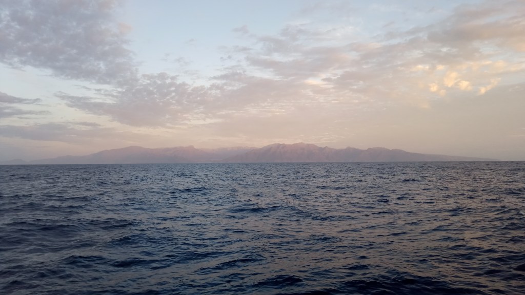 I departed Puerto de la Estaca this morning, bound for Puerto Tazacorte on La Palma. The wind has gone round to the south which does not happen often in the Canaries where the trades from the north prevail. And since this leg is due north it seemed like a good time to go. I left the pontoon at 0800 just as the sun was rising, it’s a distance of 52nm so just doable in daylight. Outside the harbour it was blowing a nice 12kts and we soon had the boat settled goosewinged and riding a predictable see from behind. About half way across I could see not only El Hierro behind me and La Palma in front, but also to my right, La Gomera, and rising above it, Teide on Tenerife. The wind stayed steady all day but the sea became increasingly lumpy and confused making for an uncomfortable ride. This seems to be the norm in these parts. Despite two emails and phone calls to the marina here I have not been able to get a response to a booking request so was a bit anxious on arrival. No one could be raised on the VHF but as I turned inside there was a marinero waiting on the reception pontoon. So here I will stay tonight and hopefully get a space tomorrow although it does appear jam packed.