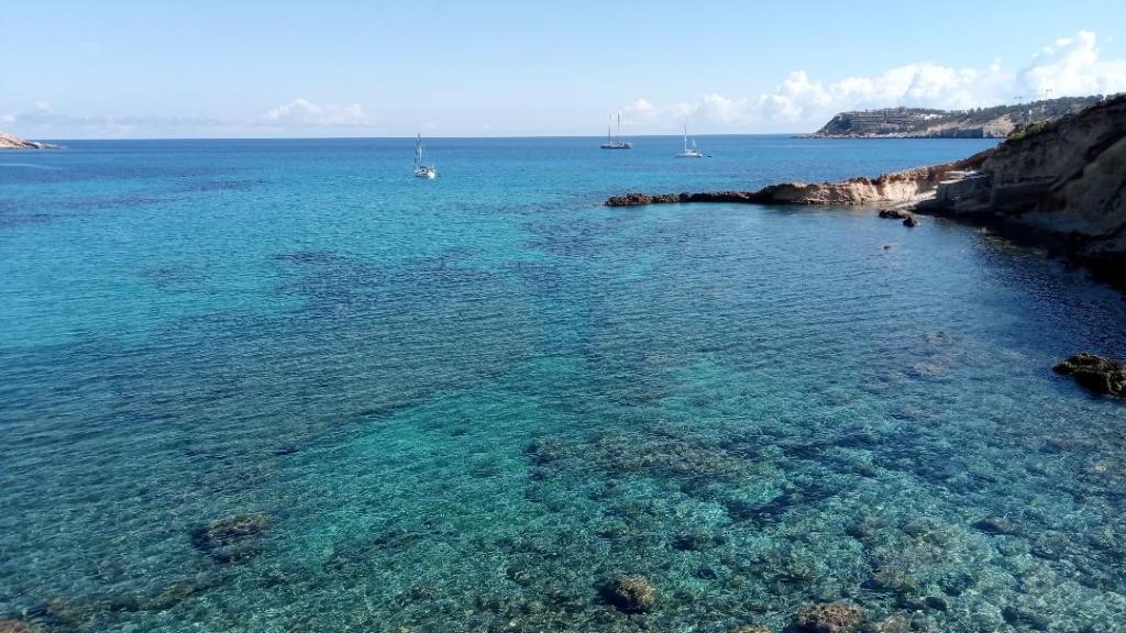 Mid afternoon Wednesday I set off from Illa de Cabrera for the passage to Ibiza, 63nm distant. Forecast was for F3/4 E to SE all night so a dead run. In the park Rangers office they had a screen showing live footage from a web cam monitoring close up an Osprey nest with a couple of chicks and the mother. The nest is on a ledge on the cliffs at the entrance to the lagoon so as I departed I was scanning the cliffs intently but could not spot it, so well camouflaged against the rocks. The crossing was happily uneventful this time and I arrived mid the following morning at Cala Xarraca on the north coast of Ibiza. Close by me in the anchorage was the expedition vessel Tara. Its has an auspicious history (see https://fondationtaraocean.org/en/schooner/tara-schooner/) and notably was Sir Peter Blake’s boat, the one on which he was killed by pirates off Brazil.