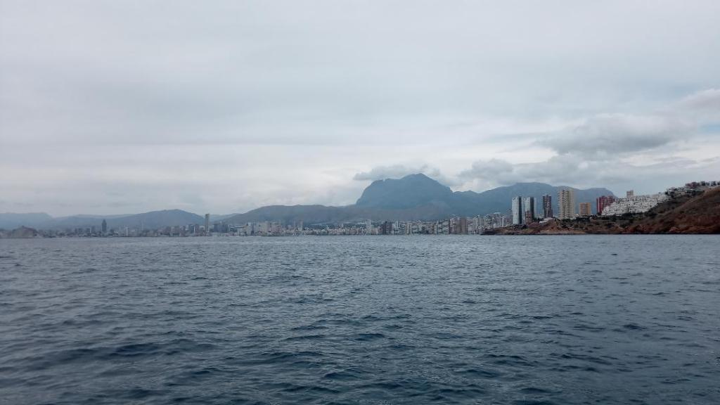Tuesday, very liight wind, sea breeze basically, expected but I set off in hope of covering at least some miles south. The coastline is very built up and when I reached Benidorm Bay I could not believe my eyes, towering skyscrapers. There is simply nowhere in the 15 mile length of the bay that is either available or suitable to anchor and with a failing wind by 3pm there was no way of reaching beyond without motoring. However Benidorm Island, a couple of miles offshore has half a dozen mooring buoys, just perfect. There is a large colony of black tipped gulls there and they were making their presence known.