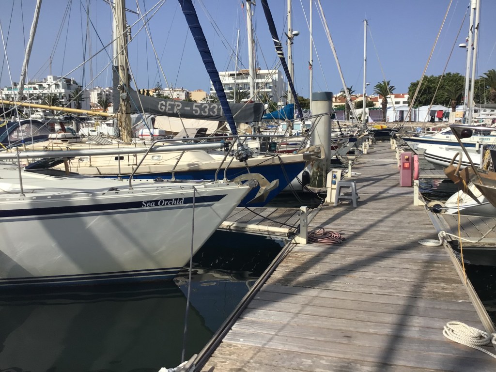 Having been pinned down in Culatra for three days by strong north westerly winds every day from midday till mid evening and forecast to continue for many days to come, the only way forward was going to have to be a night sail. So on Wednesday evening before dark I extracted the hook buried deep in the sand and mud, and sailed to the entrance of the lagoon where I anchored to wait an hour or so for the tide to turn. Unlike other night sails which have been across open water, this one was going to be along the coast, 40 nm to Lagos, and brought with it inherent risks. The biggest risk was going to be running over a pot and fouling the rudder or prop, and then there are numerous fishing boats, not on AIS, and prone to milling around in unpredictable directions. Obviously there is also the hazard of an altercation with the hard stuff, but a less obvious hazard is not being able to identify lights of boats and navigation marks set against the blazing lights ashore. Taking naps was not going to be an option. I had barely left the entrance and turned the corner to set course NW to Lagos, when I passed the first pot by less than half a boat length ! On the plus side though I had a F4 / 5 from North all night so had a fast and comfortable sail, being just 8 nm from destination by dawn, and I anchored off the beach. The mainsail tear that I had temporarily patched up with tape, had held out well, however I had arranged for a sailmaker to do a proper repair, so I took it into the marina in the dinghy to handover to him.