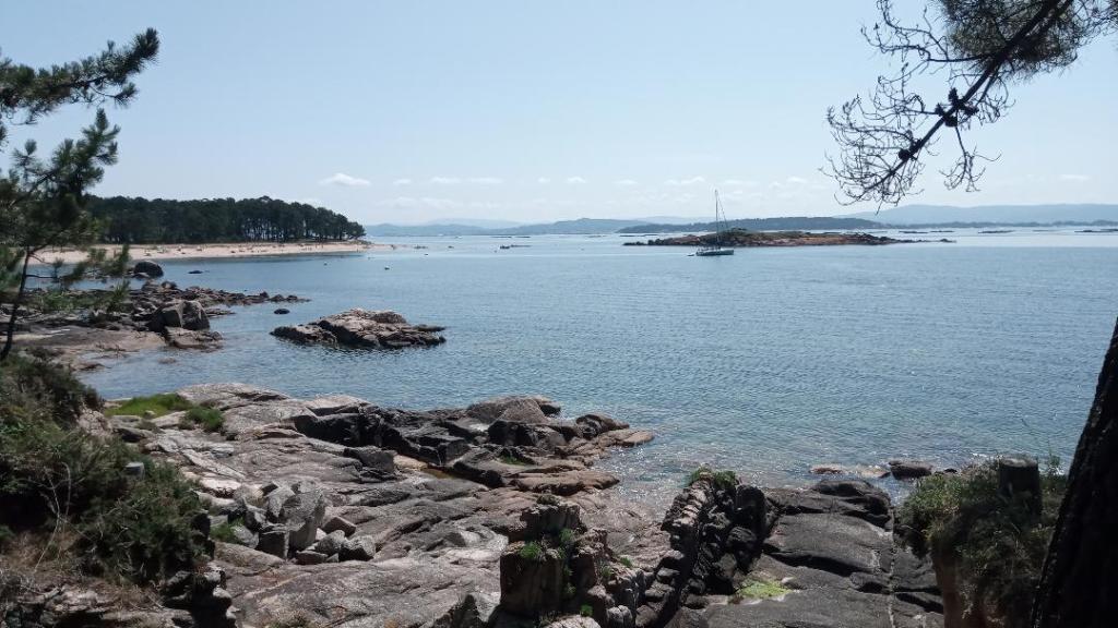 Some parts of the Rias have extensive shallows and numerous skerries and low rocky islands, much like the Scillies. The land is granite which along shorelines has been moulded into rounded outcrops. There is an abundance of cormorants and many pods of dolphins patrolling the outer reaches. Bays are backed by beaches of white sand which generally provide good holding except where the bottom has a layer of seaweed, usually in depths over 6m. Many bays are occupied by extensive mussel farms, large rafts organised into groups of dozens, spaced a few boat lengths apart so it is possible to go between them, but they are unlit so arrival in a bay at night can be tricky. When passing downwind of them there is strong smell of old rope.