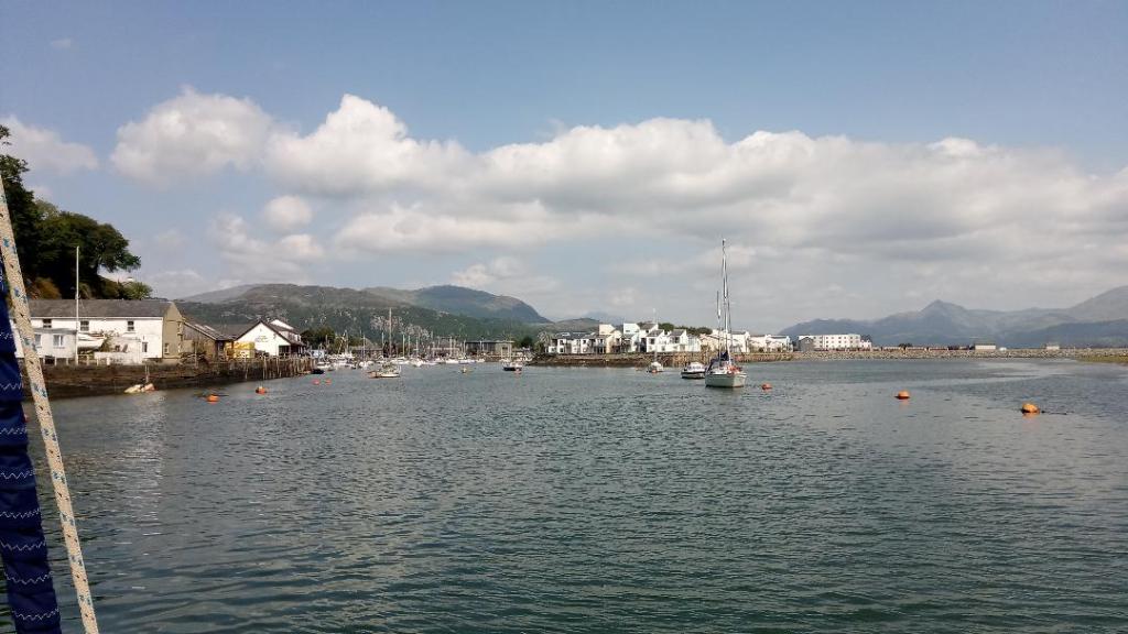 Friday forecast winds were mostly north so the plan was to reach Aberystwyth, however on calling the marina I was told it was fully booked that night. So we decided we would carry on through the night if necessary and reach the ultimate destination, Porthmadog. As it turned out winds came from NE most of the morning so we tacked out into Cardigan bay and then they rapidly backed to NW enabling us to tack and lay a course directly for PM. We saw just one other boat all day. As evening approached the wind veered to N and we closed in on the coast just north of Barmouth. After sundown the wind died so we motored the last 10nm through the east passage around St Patrick’s Causeway, around Mochras Spit, to anchor off the entrance to Shell Island at 23.30. The tide was approaching HW so would have been good to cross PM bar and take the river up to town, but whilst the channel buoys are lit, it would have been very difficult negotiating the last stretch through a myriad of mooring buoys in the dark. So we waited till the midday tide on Saturday, crossing the bar 2 hours before HW and reaching the town an hour later. The depth went as low as half a meter under the keel just off Borth Y Gest. The harbour master directed us to take the first trot mooring below the bridge and so it was that SO ended her marathon voyage on a scorching hot sunny day, just like being back in the Med ! She will stay here until arrangements for wintering are finalised, hopefully on the Isle of Skye.